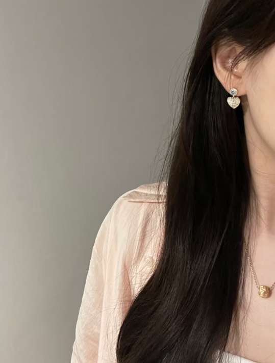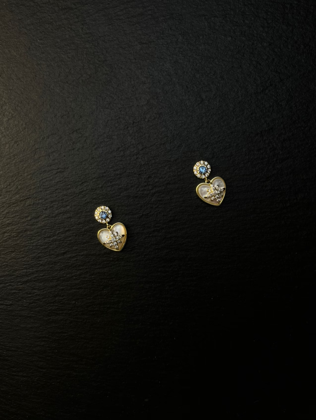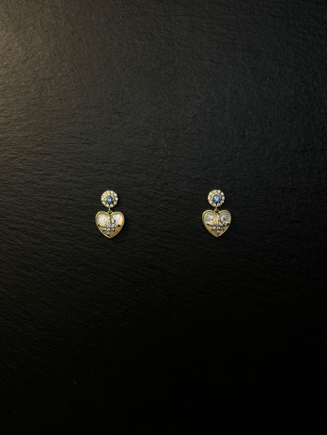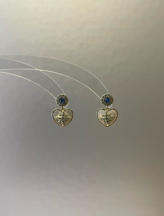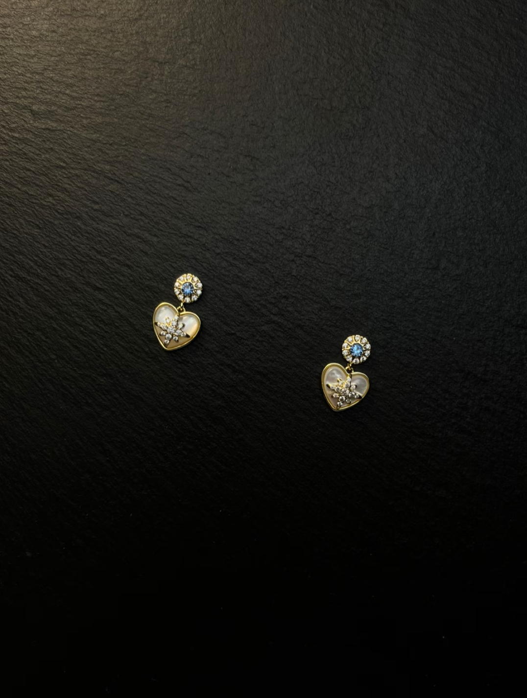 These stud earrings have a gold base. The upper part is a round decoration inlaid with a blue gemstone and surrounded by small diamonds. Below, there is a heart - shaped mother - of - pearl ornament. The surface of the mother - of - pearl is warm and glossy, and the center of the heart is inlaid with an exquisite diamond pattern. The overall design is delicate and elegant, full of romance, suitable for wearing on occasions such as dates and parties, adding a sweet temperament to the outfit.