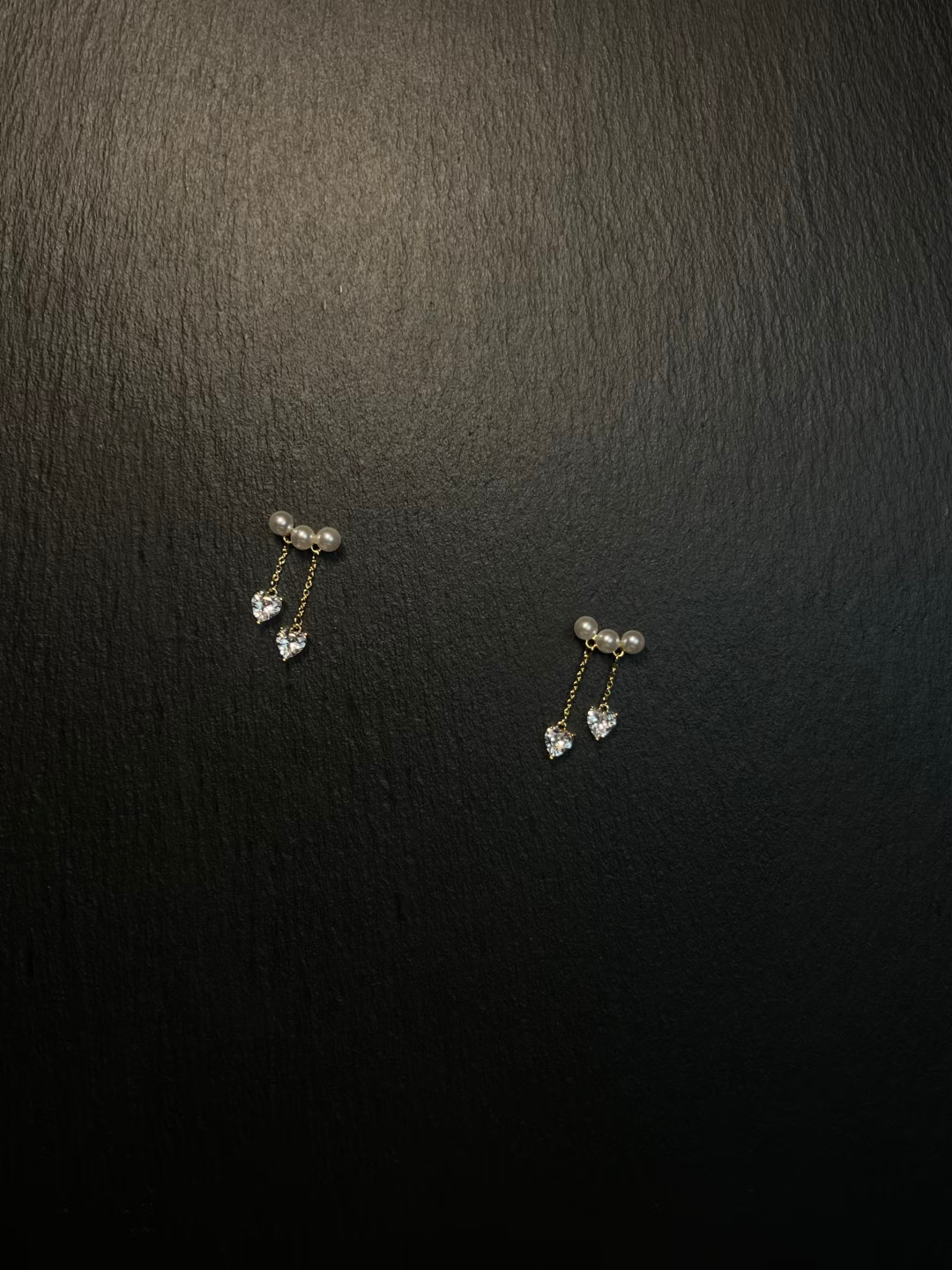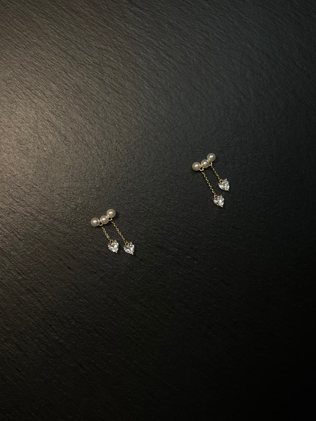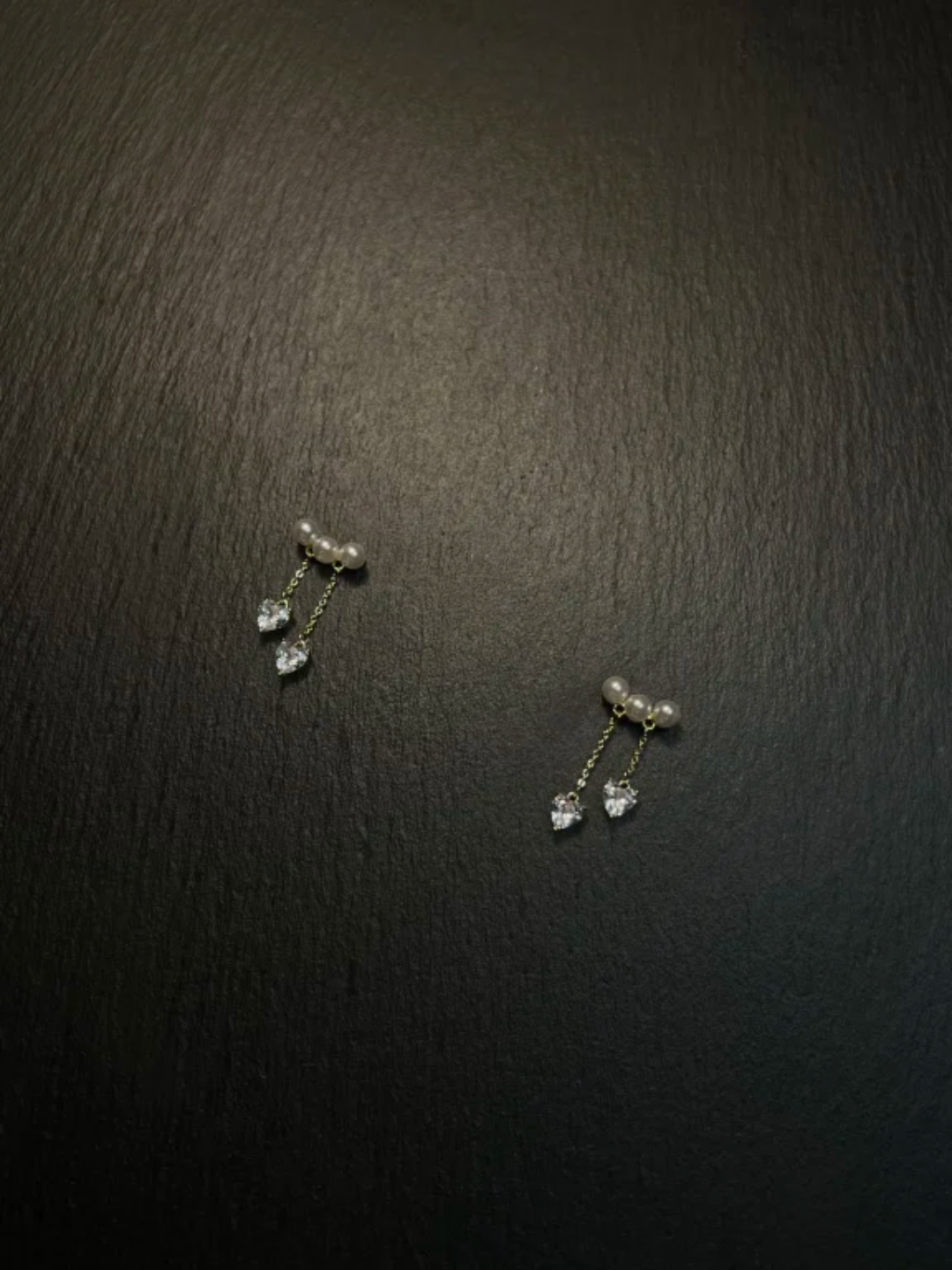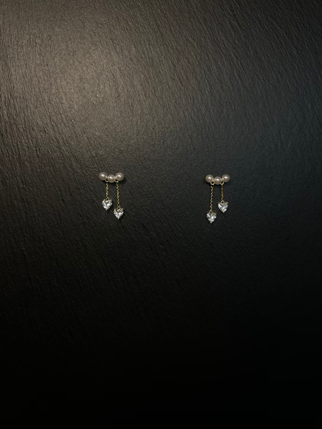 Gold - tone earrings with three tiny pearls on top. Dangling chains end in heart - shaped diamonds, blending elegance and sweetness. Perfect for adding a delicate sparkle to daily looks.